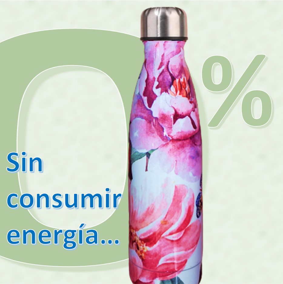 Y siendo un elemento de muchísima utilidad, además, con un bonito diseño con motivos florales y de la naturaleza. ¡Porque con esta botella dejarás de consumir botellas de plástico, y dejaras de consumir infinidad de recursos tanto en energía para mantener fría o caliente la bebida como en la propia fabricación de la botella!.